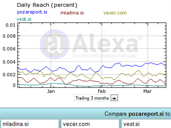 Hehehe, primerjava z Alexa.com.... Pa ne, da bi kakorkoli želel povedati kaj pozitivnega o komunističnih trobilih, ki jih Požar pravilno razkrinkaš. Alexa pač ni prav noben vir podatkov. Daj nam na primer google analytics ali moss rezultate, oba sta precej bolj realna in strokovno pridobljena in se ujemata z dejanskostjo.