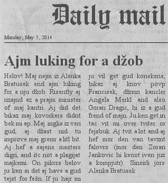 Verjetno se vsi strinjate, da je potrebno za opravljanje najvišjih državnih funkcij aktivno obvladat angleški jezik. Če bi Slovenija na primer imela premiera, ki bi aktivno govoril kitajsko, bi bili naši gospodarski stiki nedvomno veliko plodnejši. Ko boste obkrožili svojega kandidata na evropskih volitvah, se torej vprašajte, ali mu boste morali plačevati tudi prevajalca, da bo lahko tu in tam povedal kakšen evroskeptičen veleum. Ste že slišali Mencingerja, da bi kdaj povedal kaj bolj pametnega, kot so naučili Lenčico, to je "vi nid mor tajm" ? In če se že norčujete iz Bratuškove, kako bi nas šele smešil Janković, ki bi na vsako misijo s seboj vlekel vse vrste svetovalcev in prevajalcev, saj belega sveta doslej kaj veliko ni videl.