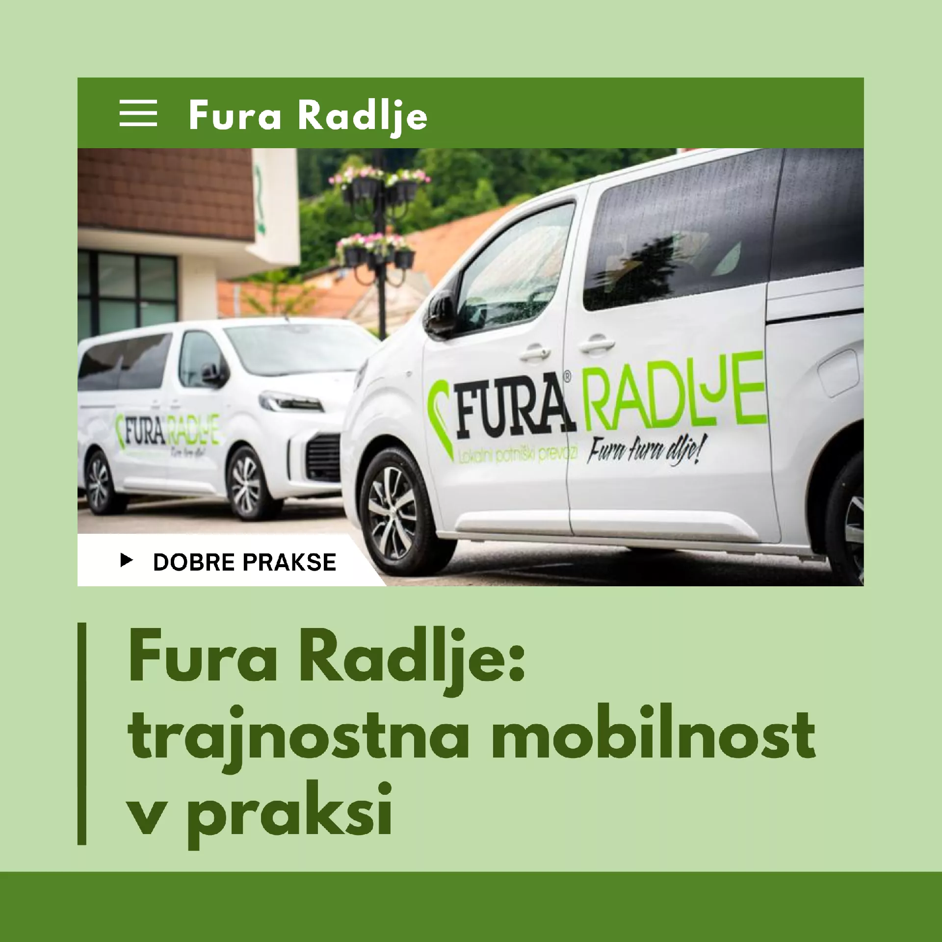 Občina Radlje ob Dravi je s projektom Fura Radlje uvedla celovit sistem trajnostne mobilnosti, ki združuje dostopnost, udobje in skrb za okolje. Gre za model, ki dokazuje, da lahko lokalne skupnosti z inovativnimi rešitvami bistveno izboljšajo kakovost življenja. Projekt vključuje brezplačen javni prevoz po krožni liniji, prevoz na zahtevo za starejše, gibalno ovirane in družine ter varen in brezplačen šolski prevoz za otroke. Vsa vozila so električna, v prihodnje pa bo sistem napajan tudi z lokalno proizvedeno čisto energijo.