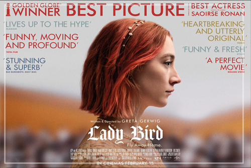 Film Lady Bird je prejel Zlati globus za najboljši film in najboljšo žensko glavno vlogo, ter 5 nominacij za Oskarja in govori o odnosu med odraščajočo hčerko in mamo. Sedemnajstletna najstnica Christine McPherson (Saoirse Ronan) je sebe preimenovala v Lady Bird, »It was given to me, by me«, in obiskuje katoliško gimnazijo v zakotnem Sacramentu, ima sanje in želje po drugačnem življenju ter hrepeni, da zapusti dolgočasno mestece v katerem odrašča. Na drugi strani je njena mama, ki kakor, da se čuti dolžno, da razruši sanje in želje odraščajoče najstnice: LADY BIRD.