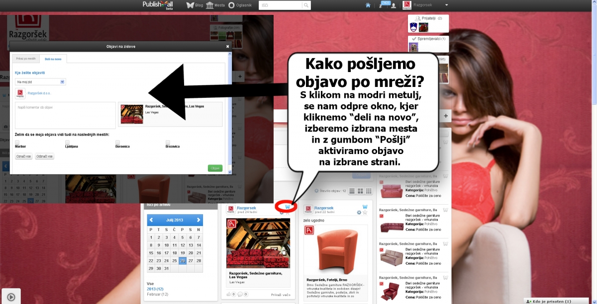 S klikom na modri metulj se odpre okno, kjer izberemo mesta, ki smo jih začeli spremljati, ter kliknemo na gumb "Pošlji". Objava je s tem poslana.