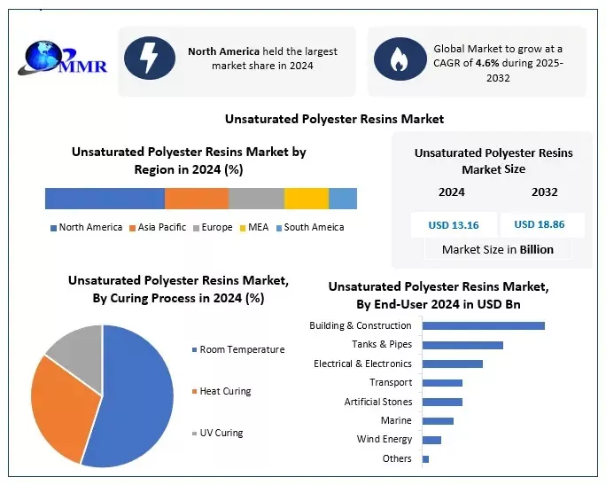 The Unsaturated Polyester Resins Market was valued at USD 13.16 Bn in 2024, and total global Unsaturated Polyester Resins Market revenue is expected to grow at a CAGR of 4.6% and reach nearly USD 18.86 Bn from 2025-2032.