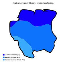 Država leži v tropskem pasu. Temperature se med letom ne spreminjajo veliko. Relativna vlažnost znaša med 80 % in 90 %. Povprečna temperatura znaša med 29 in 34 stopinj celzija. Zaradi velike vlažnosti lahko človek občuti za 6 stopinj večjo vročino kot je v resnici. Območje ima dve deževni dobi - od aprila do avgusta in od novembra do februarja. Podnebje ob severni obali je vlažno tropsko, v večjem delu notranjosti je monsunsko (kar pomeni, da so deževne dobe zelo vlažne, sušne dobe pa ne tako suhe kot v savanskem pasu, prav tako pa je tudi razlika v temperaturah med sušno in deževno dobo manjša kot v savanskem pasu (vir)). Na skrajnem jugovzhodu države, ob brazilski in gvajanski meji, pa je območje savanskega podnebja.