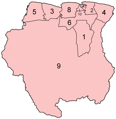 Država je razdeljena v 10 administrativnih distriktov, ki jih vodi komisionar, ki ga postavi predsednik, ki ima tudi pristojnost odstavitve komisionarja. Slika, ki prikazuje administrativne distrikte Surinama: