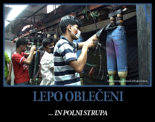 Poseben problem so kavbojke s postaranim videzom. V Turčiji so prepovedali obdelavo kavbojk s kremenčevim peskom, ker je umrlo več sto ljudi. Zdaj uporabljajo laser. Ampak, v Bangladešu so z veseljem sprejeli delo . Pri tem ne uporabljajo nobene zaščite, zato prihaja do zadušitev. Dnevno naredijo 300.000 kavbojk, predvsem za C&A in Zara. Uradne izjave modnih podjetij so dobro naštudirane. Pri H&M so seveda za varovanje narave in za trajnostni razvoj. Na uradnem seznamu je 200 nevarnih kemikalij, ki jih lahko izjemoma uporabijo, vendar ne prepogosto. Tudi v tovarnah ne vedo, kaj sploh uporabljajo, zato prihaja do nesreč (eksplozij, požarov), ki jih nihče ne razišče. Novih delavcev je dovolj in so zato lahko "pogrešljivi".