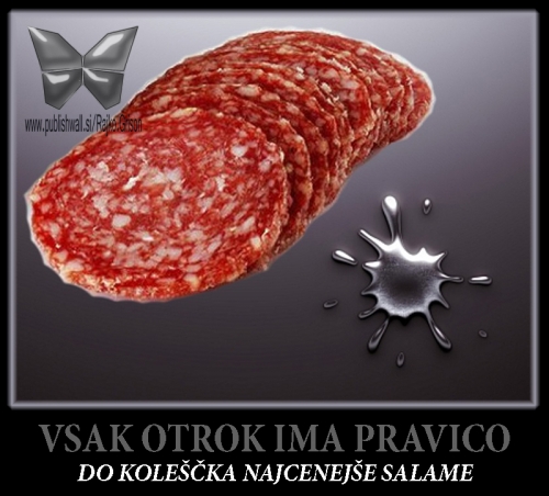 Nekega dne, mogoče da bi lahko to bila Ljubljana, Koper ali Maribor. V neki trgovini pa otrok kupuje najcenejšo štruco kruha. V žepu je bolj malo cekinov za to prodajalko prosi, samo za eno rezino Košaki Pohodniške salame. Regule so take, da prodajalka, ne morem stehtati tako male količine. Seveda poleg enega koleščka naloži na vago še dva koleščka. Ker pa ubogi otrok ni imel dovolj denarja, je bil zelo žalosten. Nekaterim prisotnim, se je to dejanje zdelo za zjokat. Tako se je neka neizmerno užaljena brezposelna poznana gospa odločila, da bo ona plačala tista dva koleščka salame. In tako se je zgodba srečno končala, otrok je lahko doma pojedel sendvič z kruhom in Košaki Pohodniško salamo. Da o revščini Mecatorjevih trgovk in kako z družino težko pridejo skozi mesec., ne bi izgubljal besed. Zato bom kar takoj povedal, solze mi tečejo iz oči. Ljudje, ali se ne zavedate, kako težko je reči nimam za hrano. Kaj lahko iz tega povzamemo, da ni lačnih otrok? Ali pa če razmišljam naprej, koliko nimate pojma o realnosti? Zakaj je mama poslala otroka po en kolešček salame? Morda bi jo bilo sram, morda mama nima dovolj denarja, morda mama ni imela časa? Kdo bi vedel.