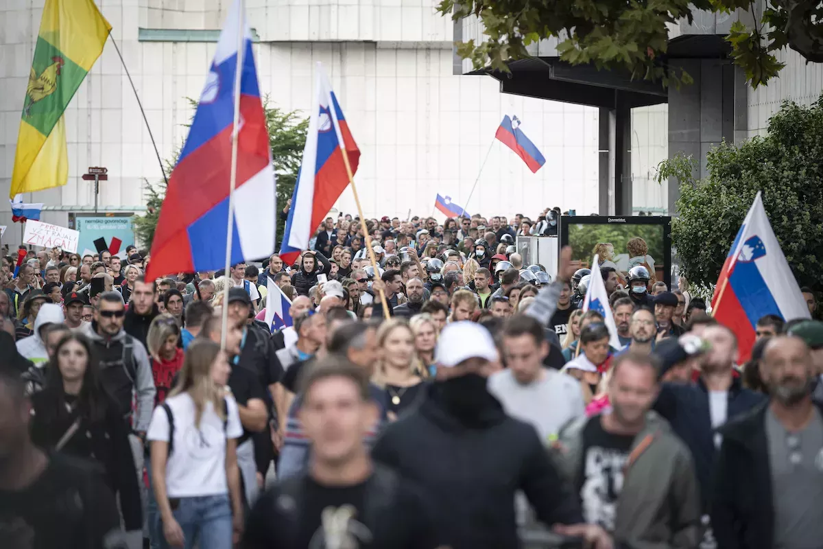 Demonstranti so se 5. oktobra 2021 v Ljubljani zbrali na shodu proti omejitvam Covid 19. APA/AFP/Jure Makovec