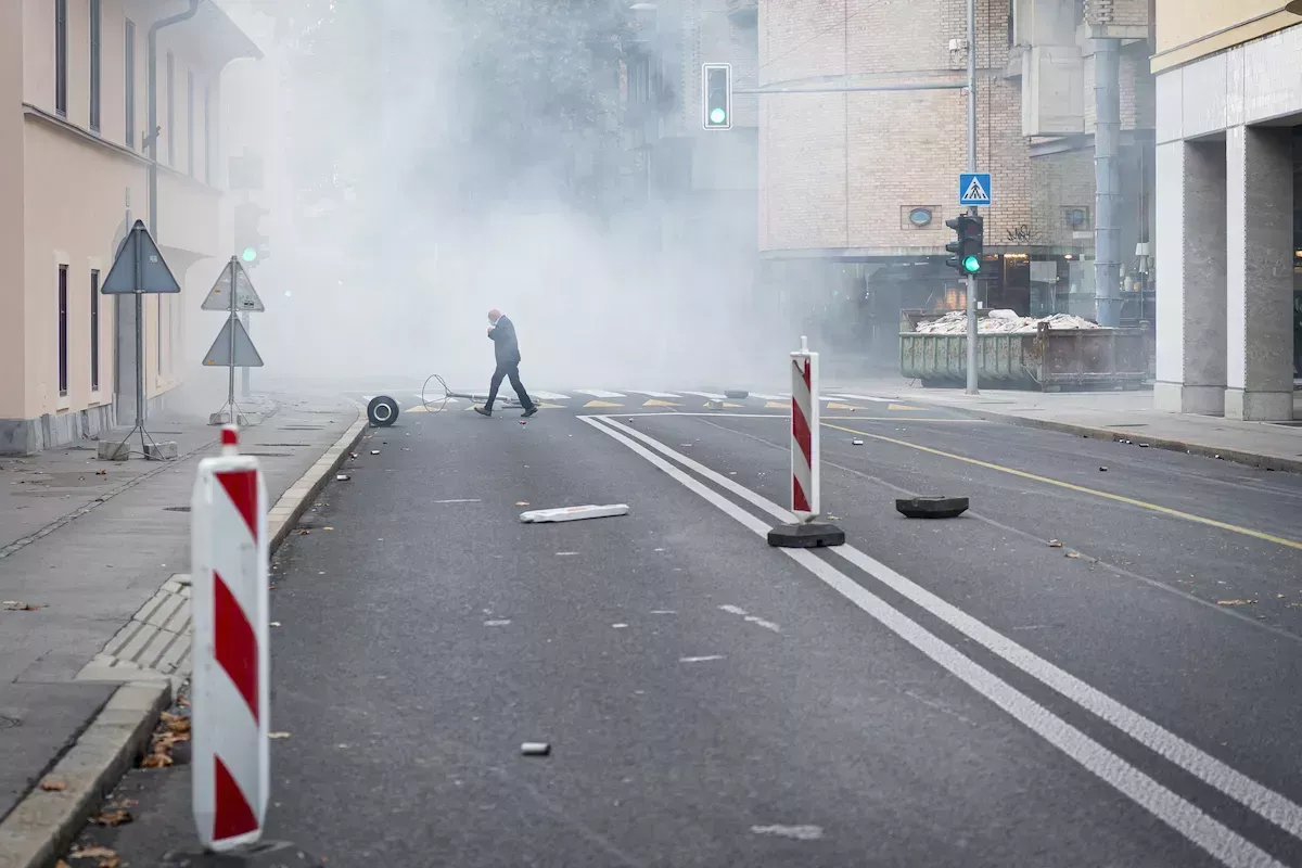 Moški je med protestom prečkal ulico pod solzivcem. APA/AFP/Jure Makovec