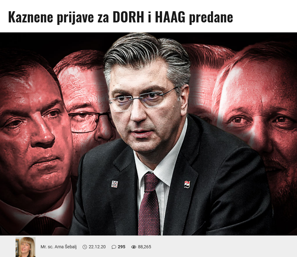 - Svi dalje navedeni ostvarili su obilježja kaznenih djela naprijed navenih: predsjednik Vlade Republike Hrvatske, osumnjičenik, Andrej Plenković, izravno je odgovoran za gore navedena kaznena djela, te ostali suosumnjičenici: Davor Božinović, podpredsjednik Vlade i ministar unutarnjih poslova, Vili Beroš ministar zdravstva, Krunoslav Capak ravnatelj Hrvatskog zavoda za javno zdravstvo (HZJZ), Alemka Markotić član Stožera civilne zaštite, Maja Grba – Bujević, članica Stožera, Damir Trut, zamjenik načelnika Stožera i predstavnik Civilne zaštite, Bernard Kaić, epidemiolog, Zvonimir Šostar, ravnatelj Nastavnog zavoda „Andrija Štampar“.