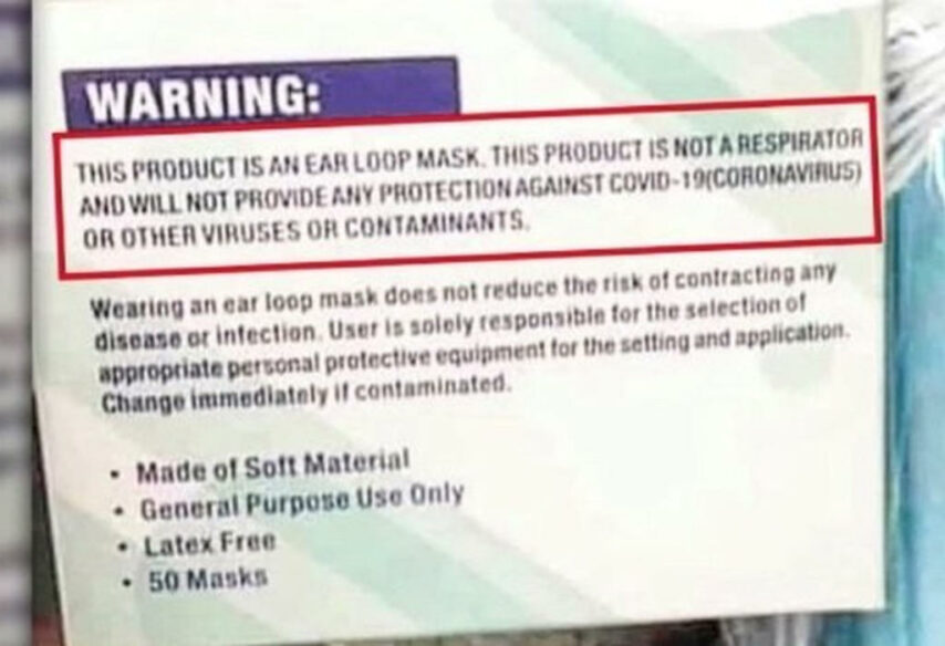 No studies have been done to demonstrate that either a cloth mask or the N95 mask has any effect on transmission of COVID-19. The fact is that masks are designed for surgeons or people who are already sick, not for healthy people, according to the WHO. Plus, the “masks” many people are wearing (bandanas, handkerchiefs, crochet, and yes, even lettuce) are a joke if you think they will stop a virus which is measured in nanometers. They won’t stop a virus. Wearing a mask is like installing a screen door in a submarine. Those who wear them might as well wear their pants backwards as well. It’s like putting up a chain link fence to keep out mosquitoes. It is a “psy-op” faux security measure. And due to the COVID-19 fearmongering from the mainstream media liars, the lemmings are all wearing masks, despite the fact that on the box, it says that the mask does NOT protect you from COVID-19.