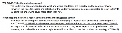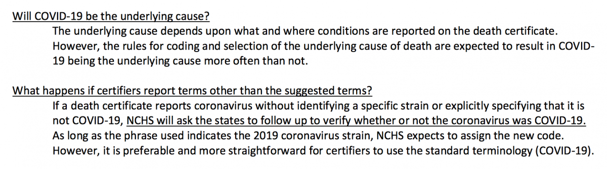 Dne 21. marca, so bili za leto 2020 naslednje posebne smernice uvedla CDC o mrliškem (in njihovega izida volitev v Državni Vital Statistics sistema (NVSS). V navodilih za overiteljev so ugotoviti COVID-19 kot "vzrok smrti" "Bolj pogosto kot ne".