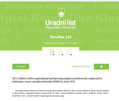 2672. Odlok o načinu ugotavljanja izpolnjevanja pogojev prebolevnosti, cepljenosti in testiranja v zvezi z nalezljivo boleznijo COVID-19, stran 7875.