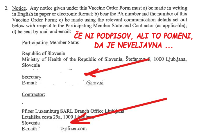 To je originalen dokument, ki ga je podpisala neznana oseba Vlade korporacije Slovenija, s čimer se je do EU in proizvajalca Pfizer zavezala trpeti vse negativne posledice in da s podpisom potrjuje, da se v popolnosti zaveda, da cepiva niso niti dokazano učinkovita, niti dokazano varna. In tega so se ob podpisu tega zločinskega dokumenta vsi zavedali.