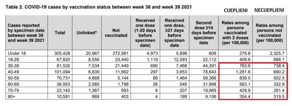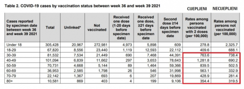 Podaci se odnose na broj novozaraženih između 36 i 39 tjedna 2021. godine. Tu se po prvi puta jasno vidi da u svim dobnim skupinama, starosti iznad 30 godina, ima više zaraženih među onima koji su primili dvije doze cjepiva protiv koronavirusa, nego kod necijepljenih.