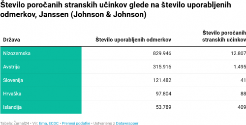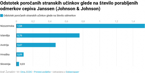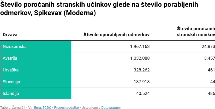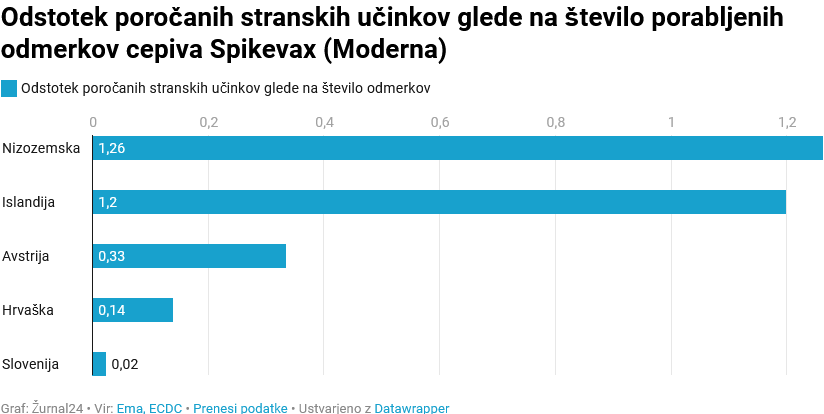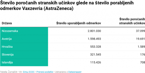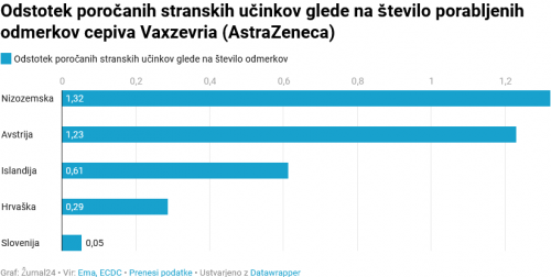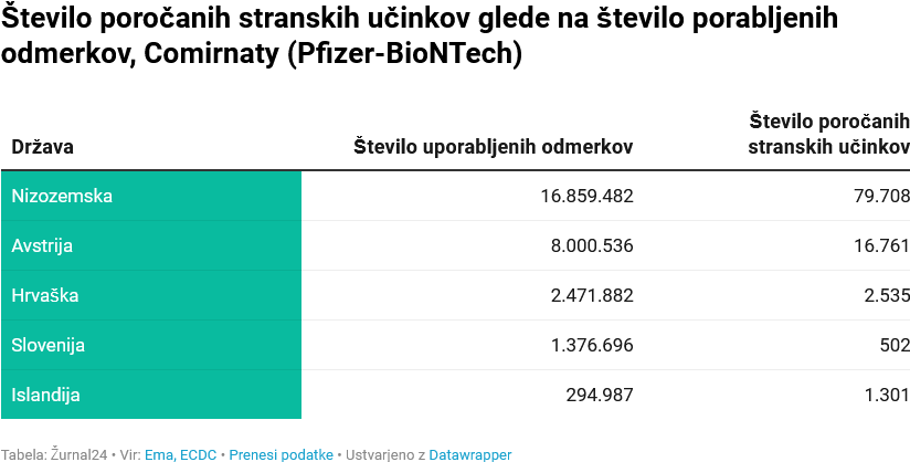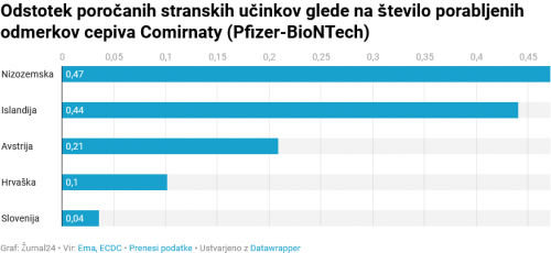 Najvišji odstotek stranskih učinkov glede na število odmerkov je sporočila Nizozemska, sledita Islandija in Avstrija. Slovenija se je znašla za Hrvaško.