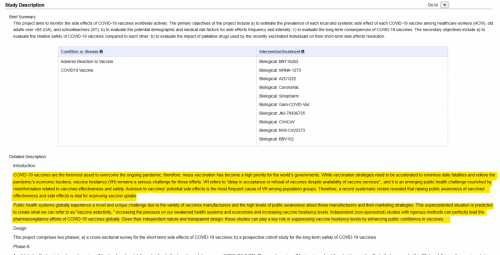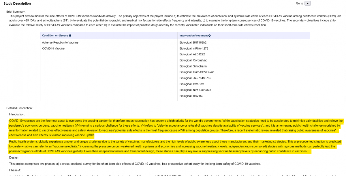 Sistemi javnega zdravja se po vsem svetu soočajo z novim in edinstvenim izzivom zaradi raznolikosti proizvajalcev cepiv in visoke stopnje ozaveščenosti javnosti o teh proizvajalcih in njihovih marketinških strategijah. Predvideva se, da bo ta situacija brez primere ustvarila tisto, kar lahko imenujemo 'selektivnost cepiva', kar bo povečalo pritisk na naše oslabljene zdravstvene sisteme in gospodarstva ter povečalo raven neodločnosti glede cepljenja. Neodvisne (nesponzorirane) študije s strogimi metodami lahko odlično vodijo prizadevanja za farmakovigilanco cepiv proti COVID-19 po vsem svetu. Glede na njihovo neodvisno naravo in pregledno zasnovo lahko te študije igrajo ključno vlogo pri zatiranju ravni neodločnosti glede cepljenja s krepitvijo zaupanja javnosti v cepiva."