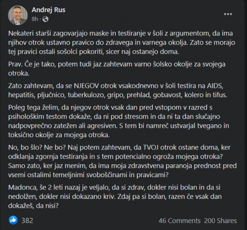 "Nekateri starši zagovarjajo maske in testiranje v šoli z argumentom, da ima njihov otrok ustavno pravico do zdravega in varnega okolja. Zato se morajo tej pravici ostali sošolci pokoriti, sicer naj ostanejo doma.