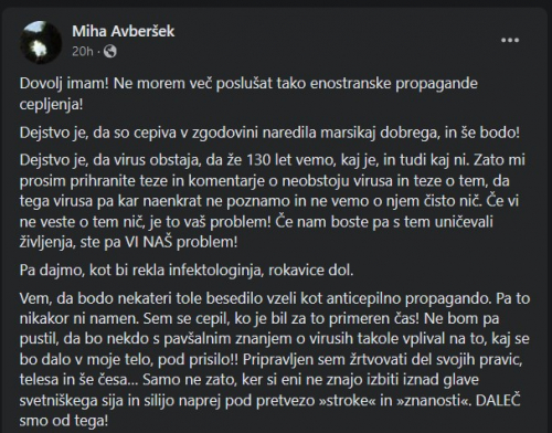 Vem, da bodo nekateri tole besedilo vzeli kot anticepilno propagando. Pa to nikakor ni namen. Sem se cepil, ko je bil za to primeren čas! Ne bom pa pustil, da bo nekdo s pavšalnim znanjem o virusih takole vplival na to, kaj se bo dalo v moje telo, pod prisilo!! Pripravljen sem žrtvovati del svojih pravic, telesa in še česa… Samo ne zato, ker si eni ne znajo izbiti iznad glave svetniškega sija in silijo naprej pod pretvezo »stroke« in »znanosti«. DALEČ smo od tega!