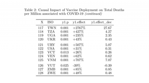 Študija na 99 straneh z naslovom »Svetovna Bayesova analiza vzročnega vpliva dajanja cepiva na smrtnost in primere, povezane s COVID-19: analiza množičnih podatkov 145 držav«, je pokazala, da je vbod povzročil, zlasti v ZDA, za 38 % več primerov Covida na milijon – in še bolj presenetljivo 31-% povečanje števila smrti na milijon.