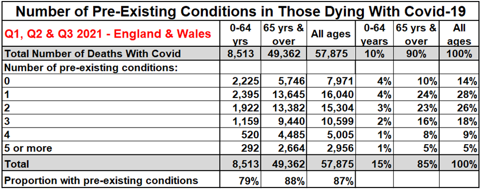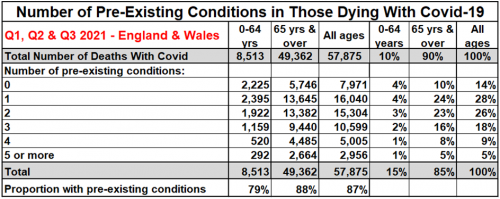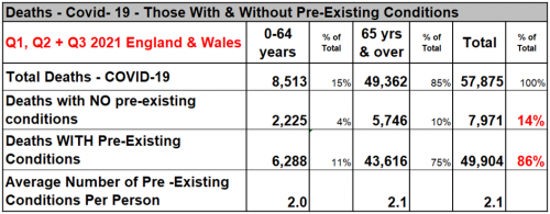 Iz tabele je razvidno, da je v prvih treh četrtletjih 2021 zaradi Covid-19 umrlo več mladih kot v letu 2020. Ti mlajši so imeli tudi več obstoječih predpogojev kot leta 2020.