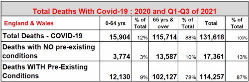 Tabela prikazuje število smrtnih primerov s Covid-19, ki jih je ONS poročalo v 1.–3. četrtletju 2021, analizirane po starostnih skupinah (navedeni sta samo dve široki starostni skupini).