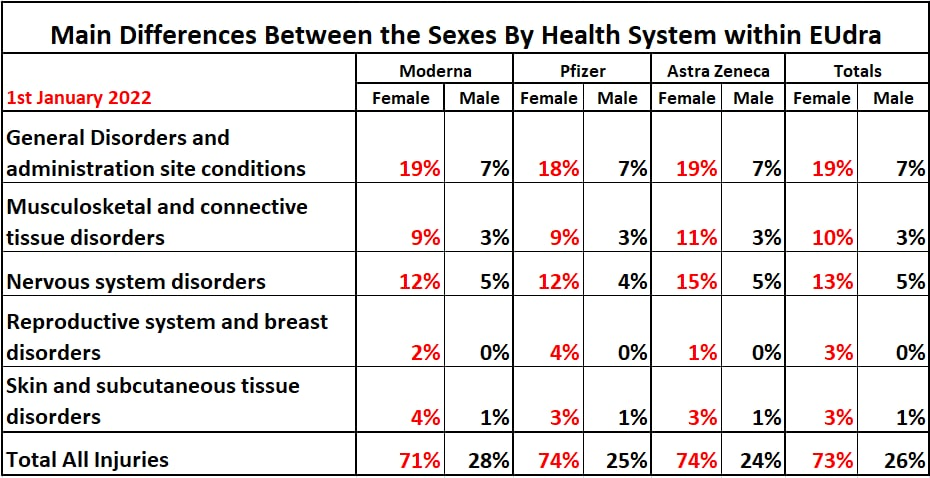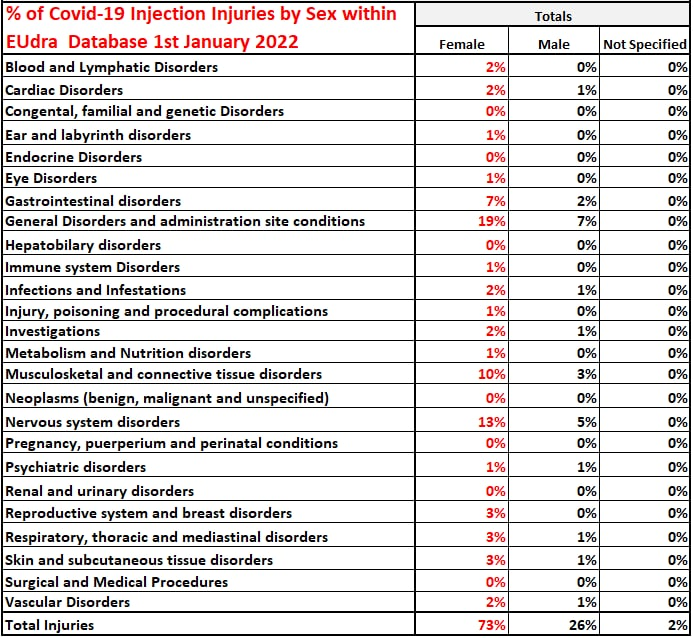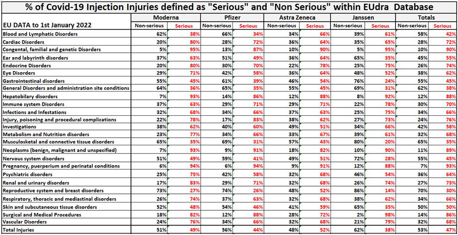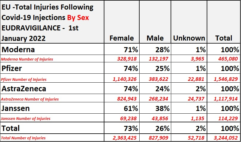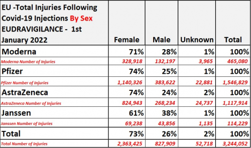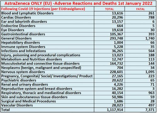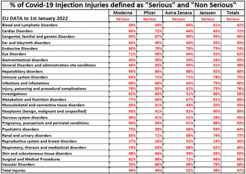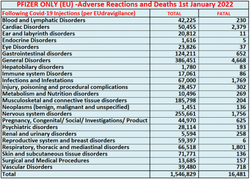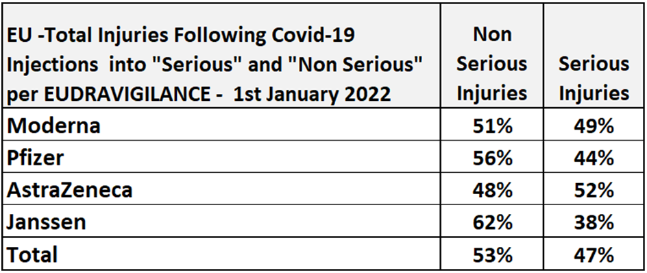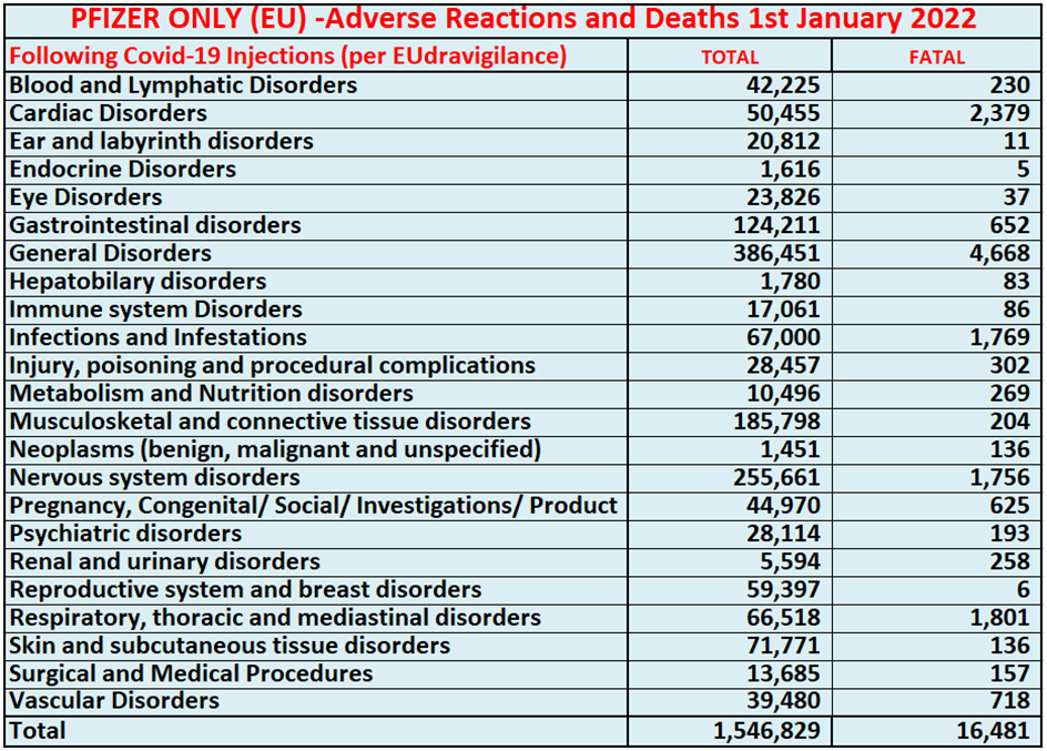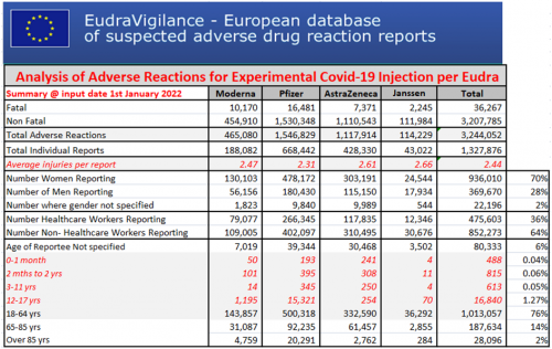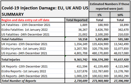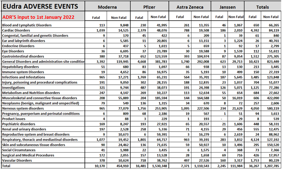 EU do 1. januarja 2022 – 36.267 smrti zaradi injiciranja Covid-19 in več kot 3,2 milijona poškodovanih, o čemer poroča več kot 1,3 milijona ljudi na zbirko podatkov EudraVigilance.