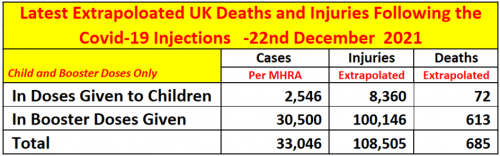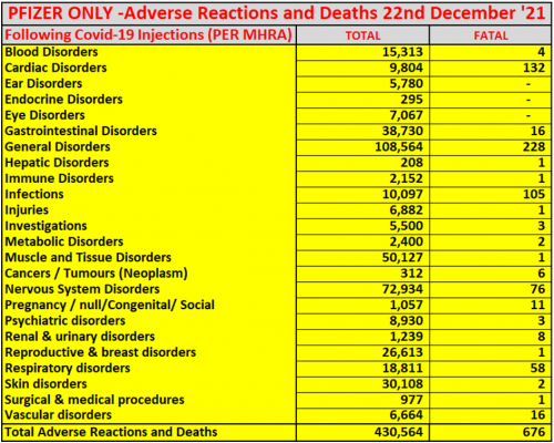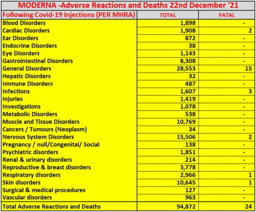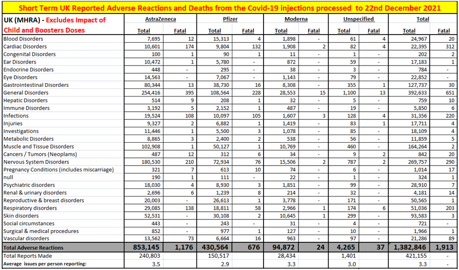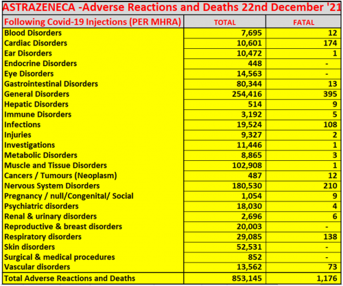 Najnovejše neželene reakcije in smrtni primeri v Združenem kraljestvu do 22. decembra 2021 po MHRA po eksperimentalnih injekcijah Covid-19 (objavila MHRA -6. januarja 2022).