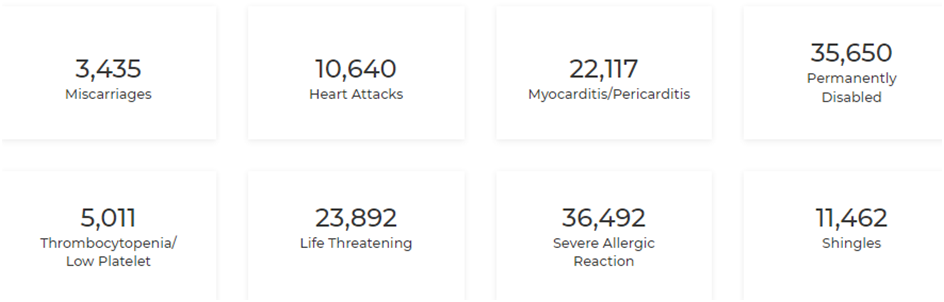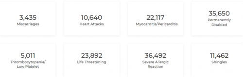 Zdaj poročajo o več kot 3.400 spontanih splavih, skupaj z več kot 10.000 srčnimi napadi in več kot 22.000 primeri miokarditisa in perikarditisa. Skoraj 36.000 ljudi je zdaj trajnih invalidov, skoraj 24.000 pa jih je po injekciji Covid-19 (še vedno) v življenjski nevarnosti.