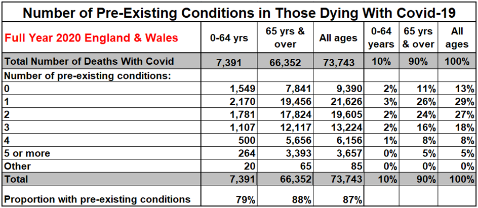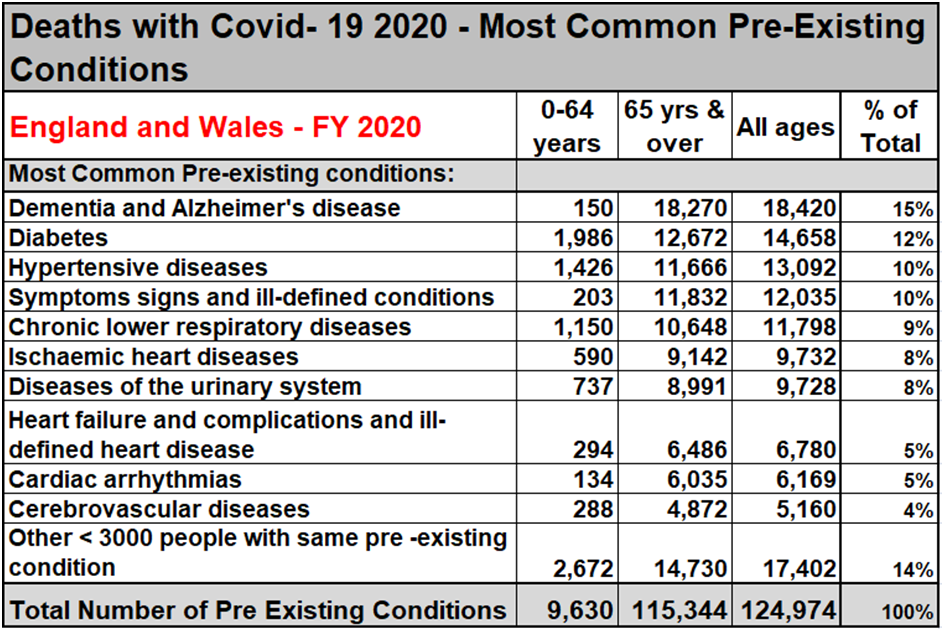 Tabela kaže, da je bilo le 4 % smrti pri osebah, mlajših od 64 let, pri ljudeh brez zabeleženih predhodnih stanj in le 10 % pri osebah, starih 65 let in več, ni imelo nobenih predhodnih stanj.