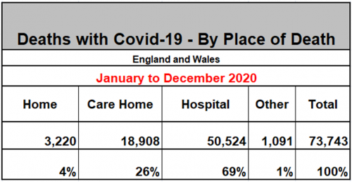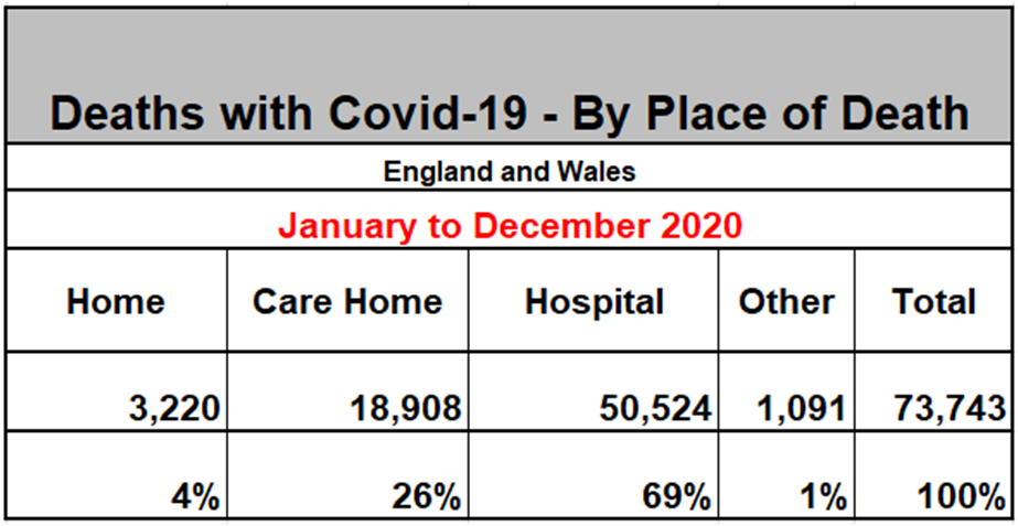 Tabela prikazuje število smrtnih primerov, ki jih je ONS poročalo o Covid-19 v letu 2020, analizirane glede na kraj smrti.