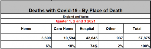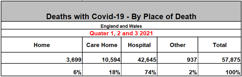 Tabela prikazuje Smrtne žrtve s Covid-19, ki jih je ONS poročalo v 1., 2. in 3. četrtletju 2021, analizirane glede na kraj smrti.
