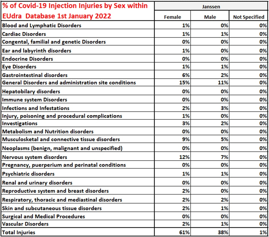 Tabela prikazuje analizo odstotka vseh poškodb (vključno s smrtnimi žrtvami) po zdravstvenem sistemu in spolu za JANSSEN (EU)
