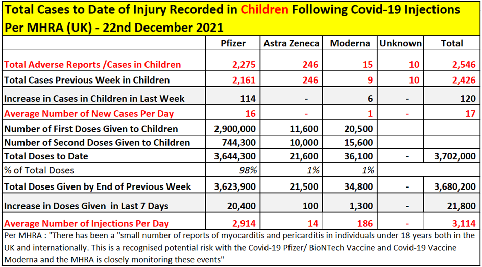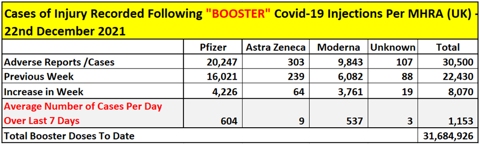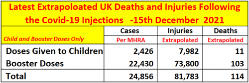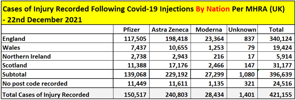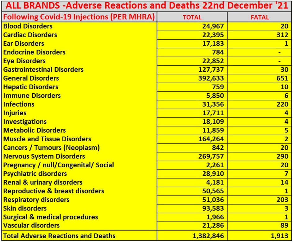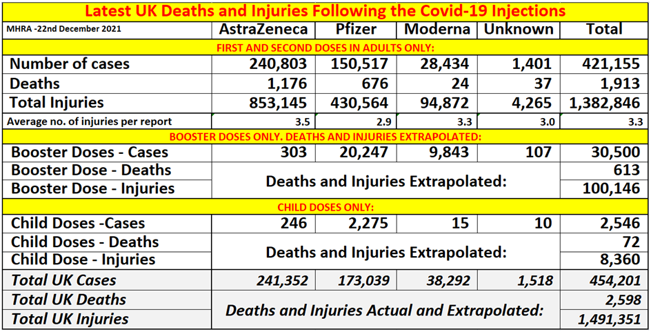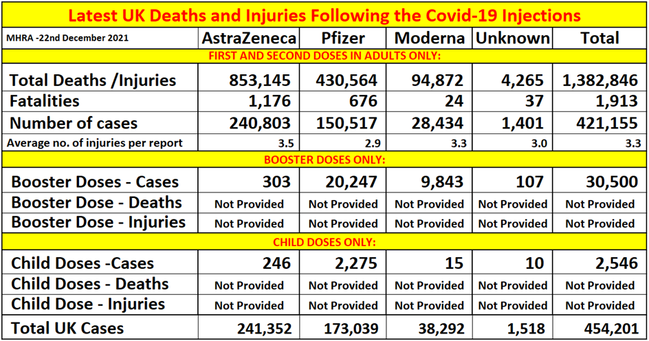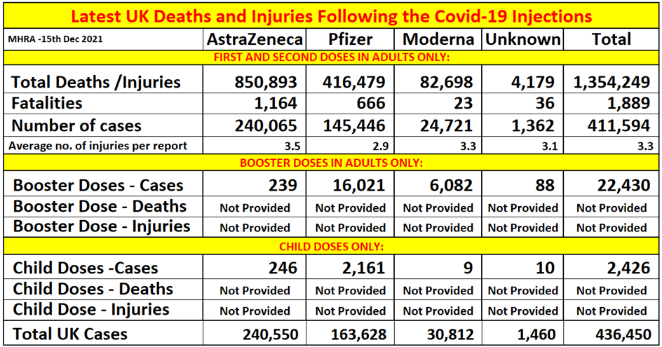 V Združenem kraljestvu do 15. decembra 2021 -1.889 smrti zaradi injiciranja Covid-19 in več kot 1,3 milijona poškodb, o katerih poroča skoraj 412.000 ljudi - na shemo rumenih kartonov MHRA.