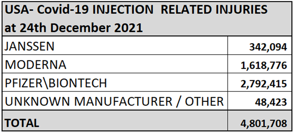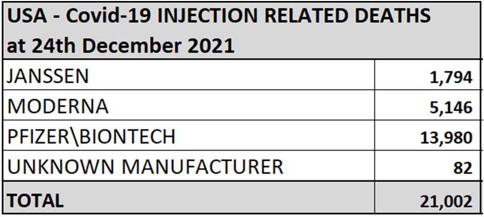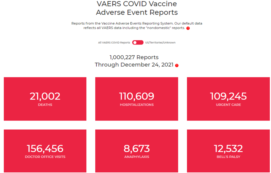 ZDA do 24. decembra 2021 – 21.002 smrti zaradi injiciranja Covid-19 in več kot 4,8 milijona poškodb, o katerih poroča več kot 1 milijon ljudi – na zbirko podatkov VAERS.