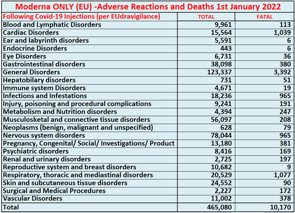 EUDRAVIGILANCE – MODERNA – 1. JANUAR 2022 – TABELA PRIKAZUJE SKUPNE POROČANE NEŽELENE UČINKE VKLJUČNO S SMRTI (MODERNA)