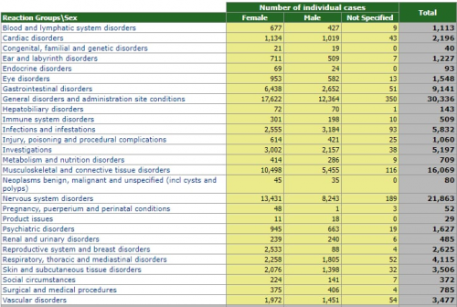 Tabela prikazuje povzetek vseh težav, o katerih je zdravstveni sistem poročal po injekcijah Covid-19, kot jih je predložila EMA.
