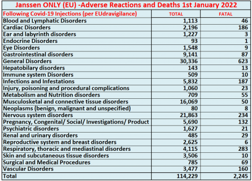 EUDRAVIGILANCE – JANSSEN – 1. JANUAR 2022 – TABELA PRIKAZUJE SKUPNE POROČANE NEŽELENE UČINKE, VKLJUČNO S SMRTI (JANSSEN)