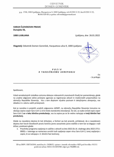 Veled verodostojnih izsledkov oziroma dokazov relevantnih znanstvenih študij ter pomembneje, glede na uradne odgovore edine pristojne agencije za registracijo zdravil in medicinskih pripomočkov na območju Republike Slovenije, Vas s tem dopisom vljudno pozivam k takojšnjemu ukrepanju, vse skladno in v okviru vaših pristojnosti.