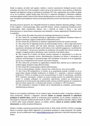 Glede na vse navedeno pričakujem, da bo naslovni organ nemudoma pričel z izvajanjem ukrepov iz svoje pristojnosti, vključno z vlaganjem ustreznih Zahtev za presojo ustavnosti in zakonitosti predpisov in splošnih aktov, izdanih za izvrševanje javnih pooblastil, saj ste skladno z določbo 23.a člena Zakona o ustavnem sodišču (Uradni list RS, št. 64/07 uradno prečiščeno besedilo, 109/12, 23/20 in 92/21) eden izmed pristojnih organov za vložitev zahteve, katero je ustavno sodišče dolžno ravnavati, za razliko od pobud državljanov.