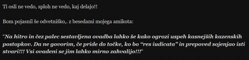 Tisti, ki bodo ali so vložili kako tožbo ali ovadbo samo zato, da bi jo in da so jo, samo zato, ker neuravnovešeno “tekmujejo” (o ja!), kdo jo bo prej, kdo jih bo več in jih poganja strastna želja po hipnem aplavzu, samo zato, da “se bo javno vedelo”, kdo je bil prvi, samo zato, ker hočejo biti oni, samo oni in najprej oni, sami, okrancljani z nekimi priznanji za neke zasluge…, nekateri pa za to ljudem poberejo celo denar, veeeliko dinarčkov (o ja!), četudi ga samo in zgolj za to ne potrebujejo, ali ga še ne potrebujejo (pod fakin ovadbo se lahko podpišejo sami, tožba pa stane, ko se začne dokazni postopek, izvajanje dokazov, izvedenska mnenja itd…), pri svojem delu pa še brezsramno uporabljajo intelektualno lastnino drugih (naj jo, samo ne brezsramno)…, ti bodo nestrokovno ZAJEBALI VSE! In vse bodo zajebali, še preden se bodo pristojni organi odločili, da je že vse zajebano in bo ta zajeb objel tudi tiste, ki strokovno ne zajebejo, preden se pristojni organi ne odločijo, da ne bodo storili ničesar in da bodo vsemu rekli zajeb.