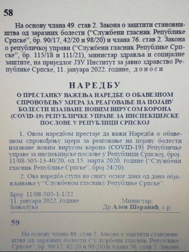 17.1.2022. Ukinute SVE kovid mere u Republici Srpskoj, objavljeno i u sluzbenom glasniku