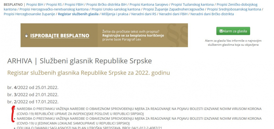 Povezava na uradni list https://www.paragraf.ba/sluzbena-glasila/arhiva-sluzbenog-glasnika-republike-srpske.html