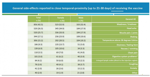 Oglejte si ogromen odstotek poročil, zlasti pri ženskah, ki doživljajo šibkost, bolečine v mišicah, tresenje, visoko temperaturo in celo omotico in bruhanje.