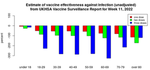 Vsi so negativni, kar pomeni, da je stopnja okužbe pri zabodenih višja kot pri necepljenih. Pri trojno zabodenih, starih od 30 do 70 let, je dosegel kar minus 300 %, pri čemer so jo najslabše odnesli tisti v svojih 60-ih, kar pomeni, da imajo te skupine več kot štirikrat večjo verjetnost, da bodo pozitivne na test kot njihovi necepljeni kolegi.