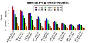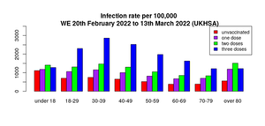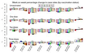 Sprememba primerov pri necepljenih, tistih z enim samim odmerkom in pri tistih z dvojnim odmerkom zvarka je zelo podobna; vztrajno zmanjšanje primerov od začetka leta, vendar so primeri v podatkih za ta teden v primerjavi s prejšnjim tednom na splošno ostali nespremenjeni.