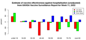 Pomemben vidik zgornjega grafa je, katere starostne skupine imajo koristi od zmanjšane hospitalizacije po cepljenju. Zdi se, da ima starostna skupina od 50 do 80 primerno raven zaščite (približno 50 %) in to bi lahko podpiralo "cepljenje" v tem starostnem razponu za tiste, ki z veseljem nadaljujejo s sprejemanjem obnovitvenih odmerkov za nedoločen čas (odvisno od stranskega učinka/zapleta). stopnje). Zdi se, da je zaščita starejših od 80 let slaba – to je žalostno, saj je prav ta starostna skupina deležna največjih hospitalizacij in smrti. Opažam tudi, da se zdi, da se hospitalizacija pri osebah, mlajših od 50 let, zelo malo zmanjša; vprašljivo je, ali je ta stopnja zmanjšanja sploh relevantna za mlajše posameznike.