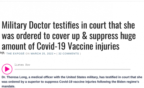 Vir https://dailyexpose.uk/2022/03/25/military-doctor-testifies-ordered-suppress-covid-vaccine-injuries/