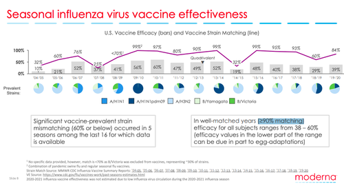 Strokovnjaki pravijo, da je nizka učinkovitost cepiva v tej sezoni posledica neusklajenosti med komponentami virusa cepiva in virusi, ki krožijo. Vendar pa Moderna kaže, da se tudi v "dobro usklajenih letih (≥90 % ujemanja) učinkovitost za vse subjekte giblje med 38-60 %", pri čemer ugotavlja, da so nižje vrednosti učinkovitosti, manjše od 40 odstotkov, lahko deloma posledica prilagoditev jajčec.