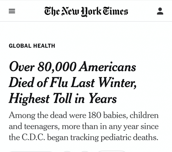 Pravzaprav je to še huje, ker je bilo leto 2017-18 – ki ni prikazano na tem grafikonu – najhujše leto po smrti zaradi gripe v zadnjih desetletjih – verjetno od gripe v Hongkongu leta 1968.