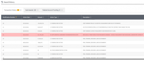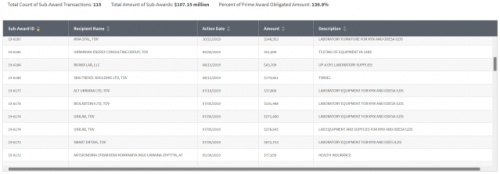 »Zgodovina nagrad« za pogodbo vsebuje zavihek »Podizplačila«, ki podrobno opisuje prejemnike, datum izvedbe, znesek in zelo kratek opis za 115 transakcij izplačil. Večina izplačil je izjemno vsakdanjih za stvari, kot so »laboratorijska oprema za Kijev« ali »pisarniško pohištvo za Kijev«.